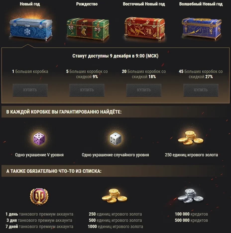 * Большие новогодние коробки вы сможете приобрести с 9 декабря 09:00 (МСК) по 11 января 09:00 (МСК) — как в Премиум магазине, так и в игровом клиенте.