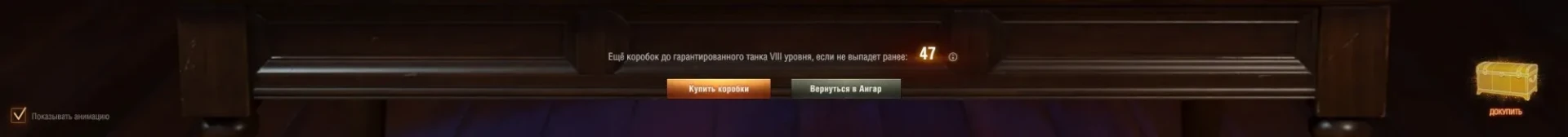 Теперь допустим, что вам выпал танк на гарантированной 50 коробке из 90 открытых. Мы вам советуем докупить ещё 10 коробок, дабы получить гарантированно танк 8 уровня. И так надо рассчитывать все случаи открытия коробок. Если вам остаётся, допустим, от 5 до 20 коробок до гарантированного танка. Докупайте! Вы окупите все последние купленные коробки в голде.