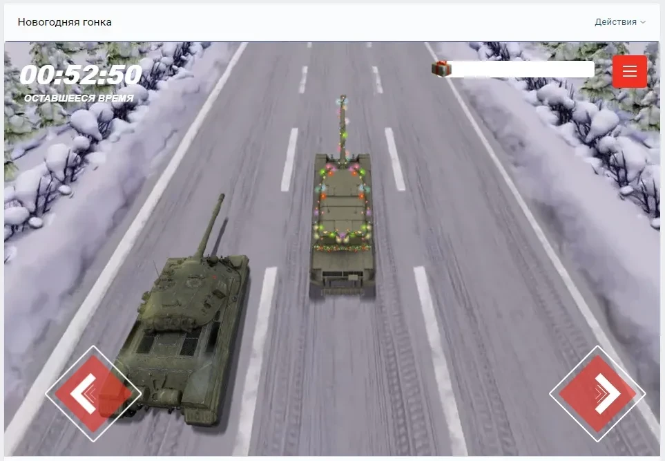- Далее нас ждёт простая аркадная гонка, где нужно собирать подарки в теч. 1 минуты и избегать столкновения с другими танками. По мере игры скорость движения увеличивается. Каждая авария = -1 подарок из собранных на текущий момент.