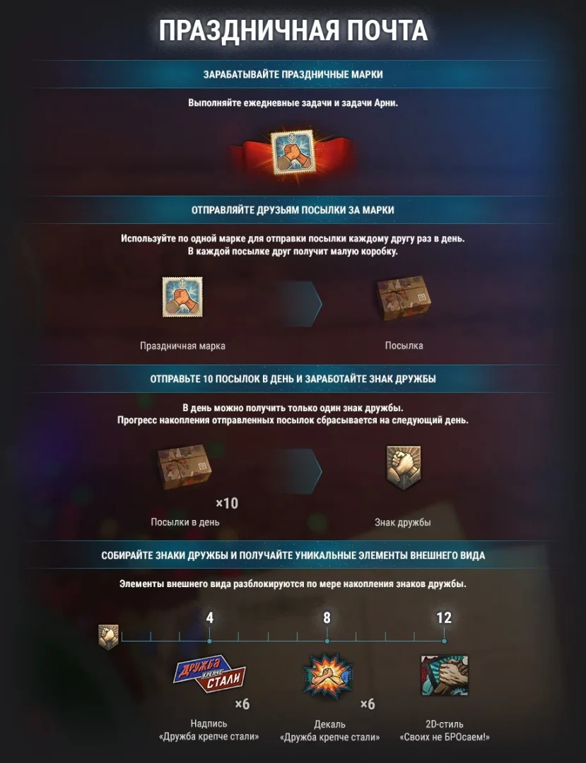 Отправляя посылки своим друзьям, вы сможете получить элементы внешнего вида (кастомизацию). Отправьте 10 посылок за день, чтобы заработать один знак дружбы. За накопленные знаки дружбы вы можете получить: