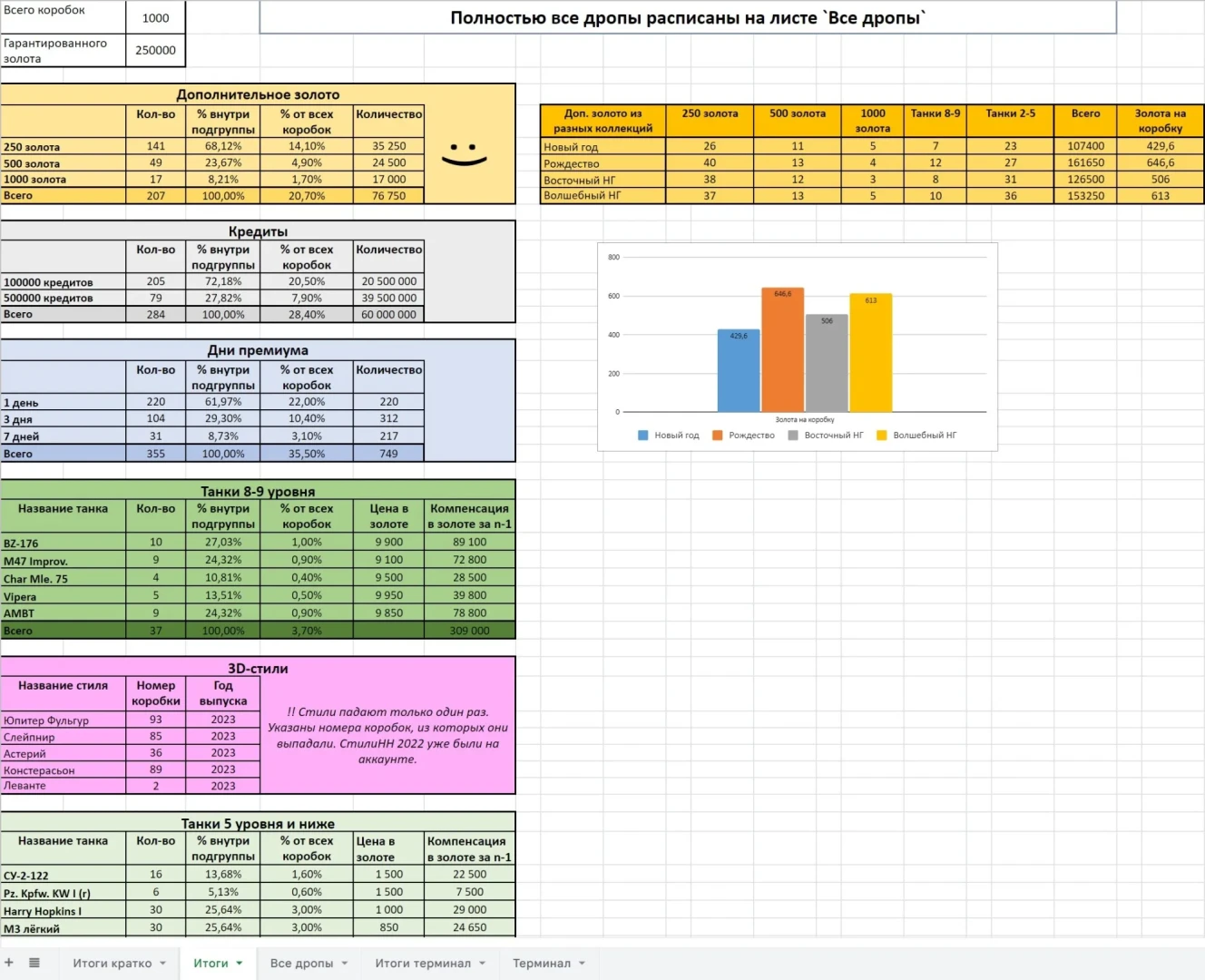 Статистика базируется исключительно на коробках, открытых в RUBY-регионе (имущество и шансы везде одинаковое), каждое открытие имеет скрин и записано текстово в табличку. Открыто равное количество каждого из 4 видов коробок.