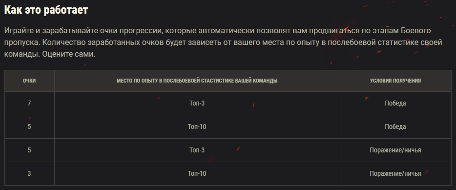 Играйте и зарабатывайте очки прогрессии, которые автоматически позволят вам продвигаться по этапам Боевого пропуска. Количество заработанных очков будет зависеть от вашего места по опыту в послебоевой статистике своей команды. Оцените сами.