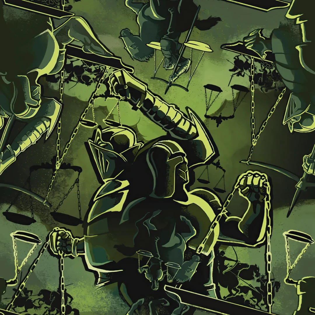 «Воздаяние» — «...и третьим явился он, на жеребце чёрном, как сама ночь, и крепко сжимал в руке весы. И лежало самое тёмное зло на чаше тех весов, а напротив — сияющее чистотой добро, и колебались плечи весов, как полный колос на ветру, и каждый раз воздавал всадник должное тем, в чью сторону чаша склонялась. И мерил он единой мерою богатых и нищих, сильных и слабых, злых и добрых, и платил им по делам их».