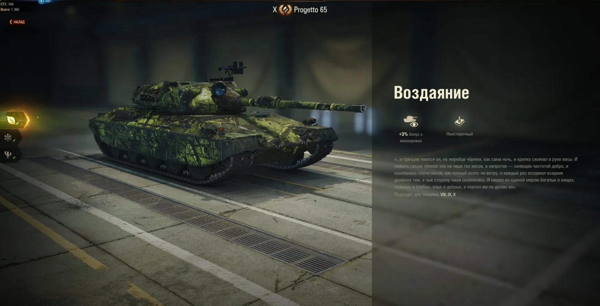 Неисторичный. Можно наносить этапные декали, группа: Особые. Установить можно только на танки 8-10 уровня. Тех. цена: 750 золота.