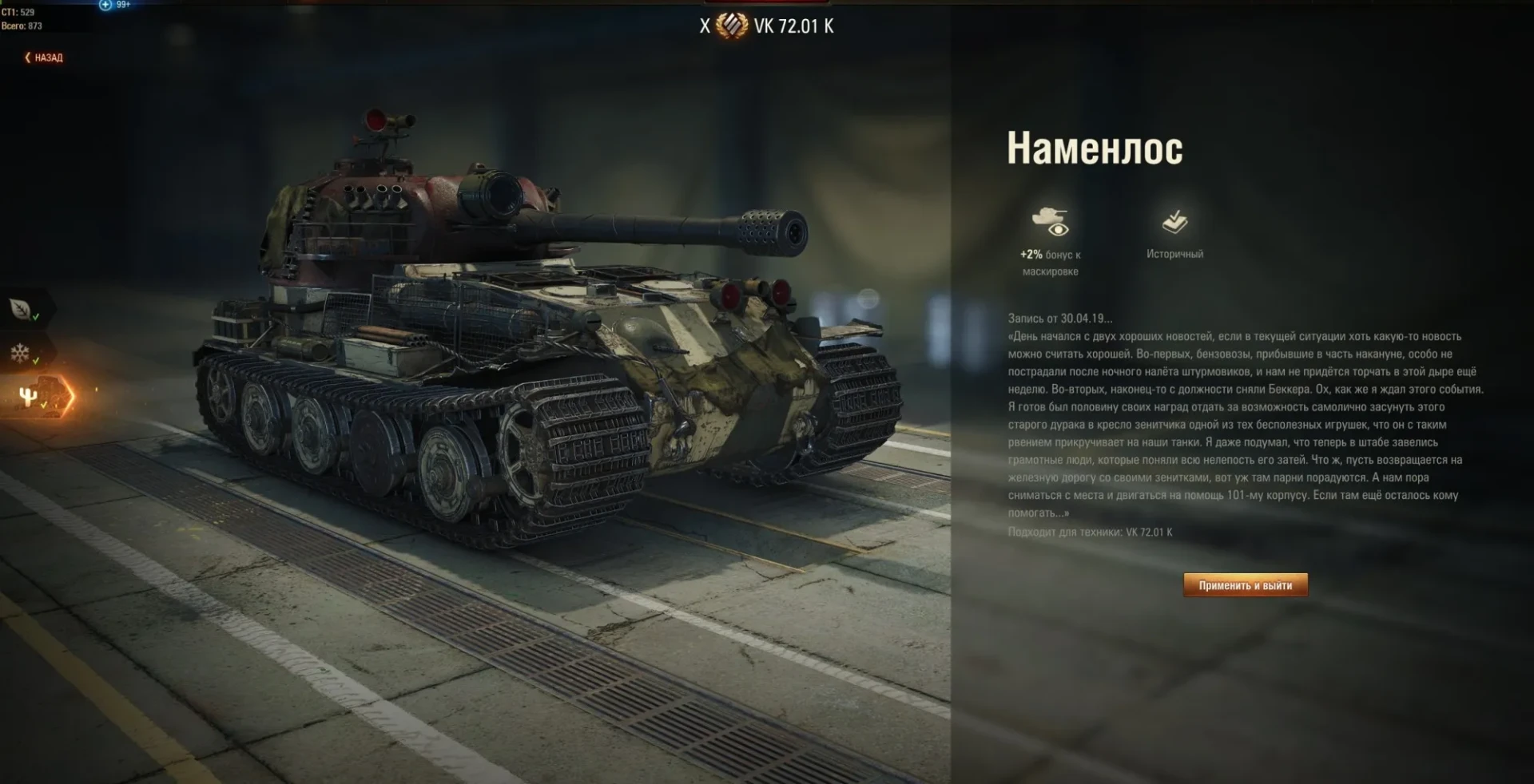 Историчный. Можно наносить этапные декали, группа: Основные. Максимум на аккаунт: 1. Только для танка: VK 72.01 (K). Тех. цена: 4000 голды.