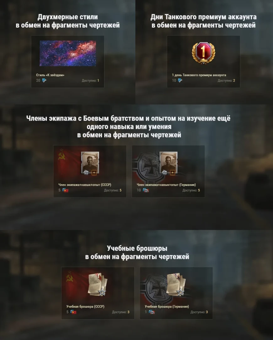 Однако фрагменты чертежей могут накапливаться и лежать без дела. И мы предлагаем протестировать механику их обмена на игровые ценности, среди которых: