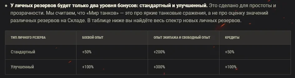 - У личных резервов будет только два уровня бонусов: стандартный и улучшенный. Это сделано для простоты и прозрачности. Мы считаем, что «Мир танков» — это про яркие танковые сражения, а не про оценку значений различных резервов на Складе. В таблице ниже вы найдёте весь спектр новых личных резервов.