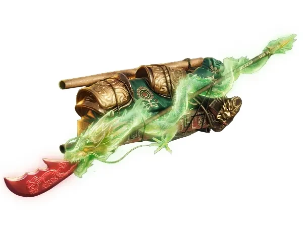 Описание: Легендарный гуань дао, которым был вооружён Гуань Юй в романе «Троецарствие». Неожиданно тяжёлое оружие, как гласят сказания, обладает магической силой зелёного дракона.
