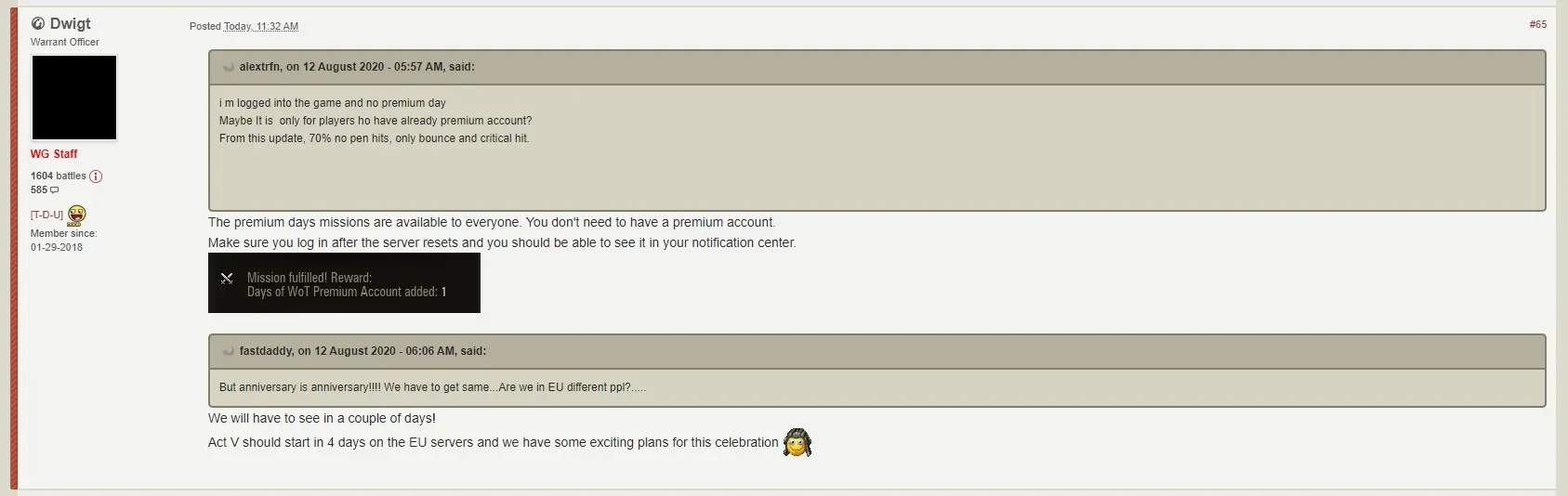 «Акт V должен начаться через 4 дня на серверах EU (везде одинаково в том числе и RU), и у нас есть несколько захватывающих планов на этот праздник :)» — WG Staff WOT EU.