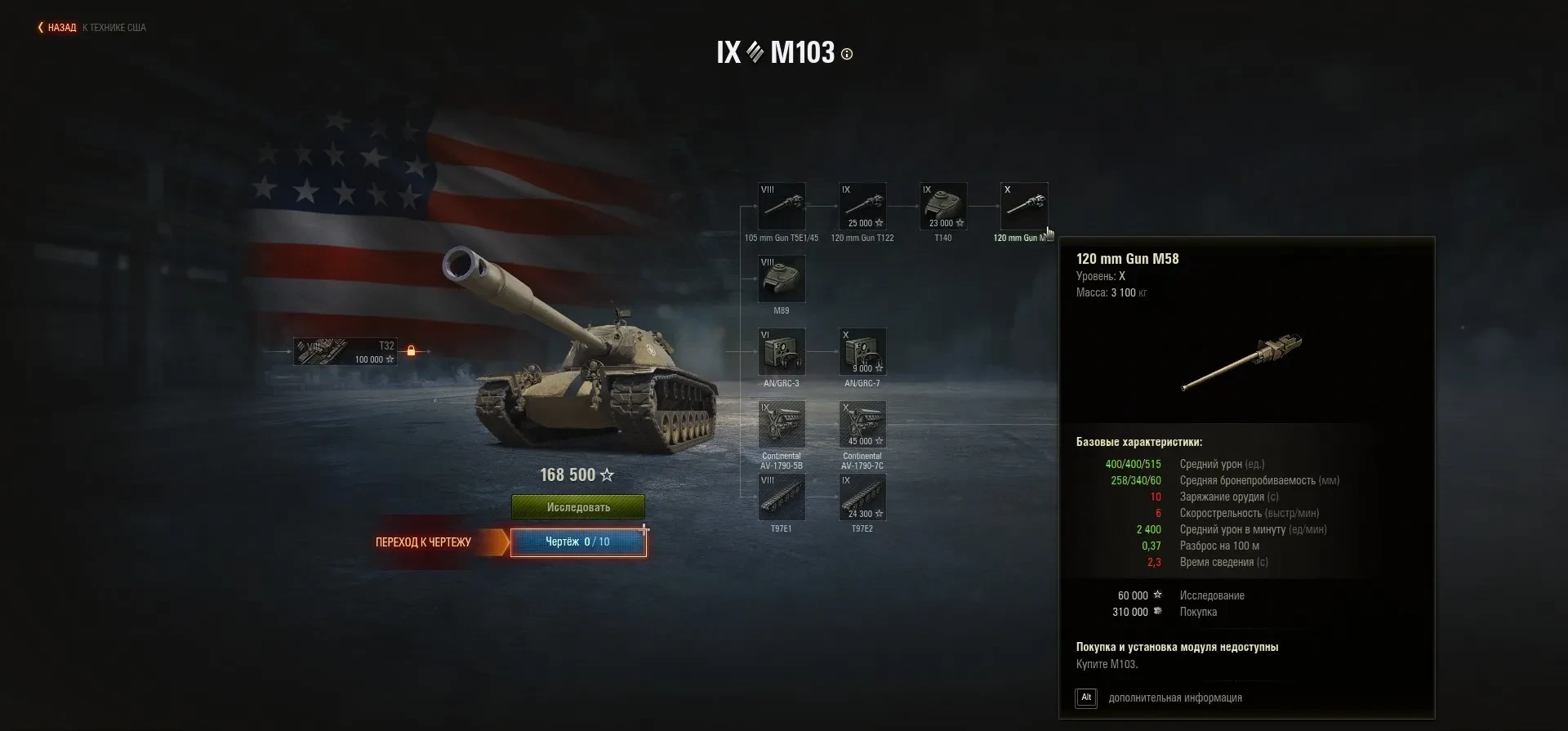 - 120 mm Gun M58 - 60 000 опыта — M103, T110E5.