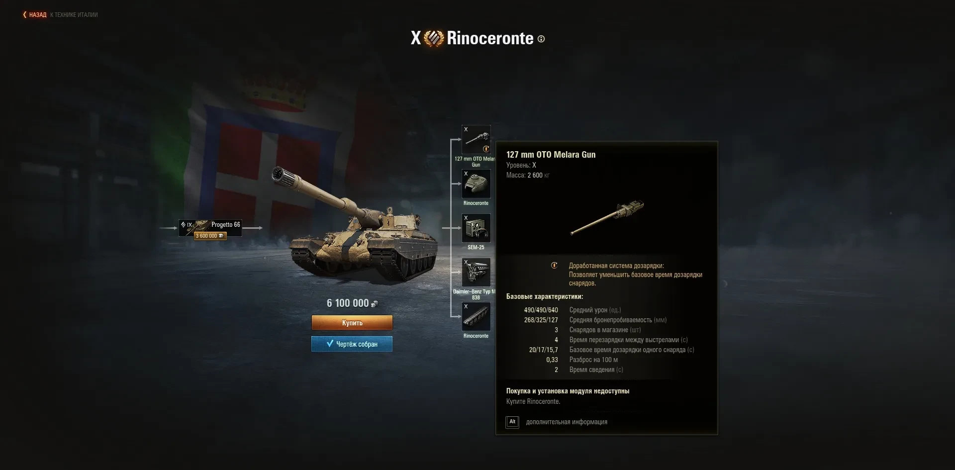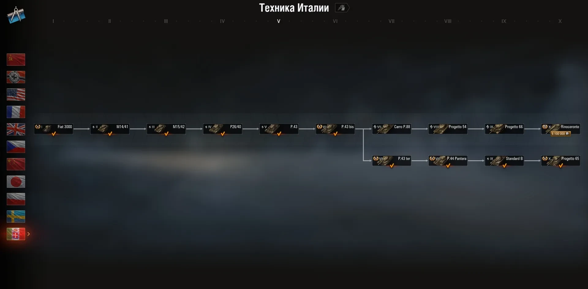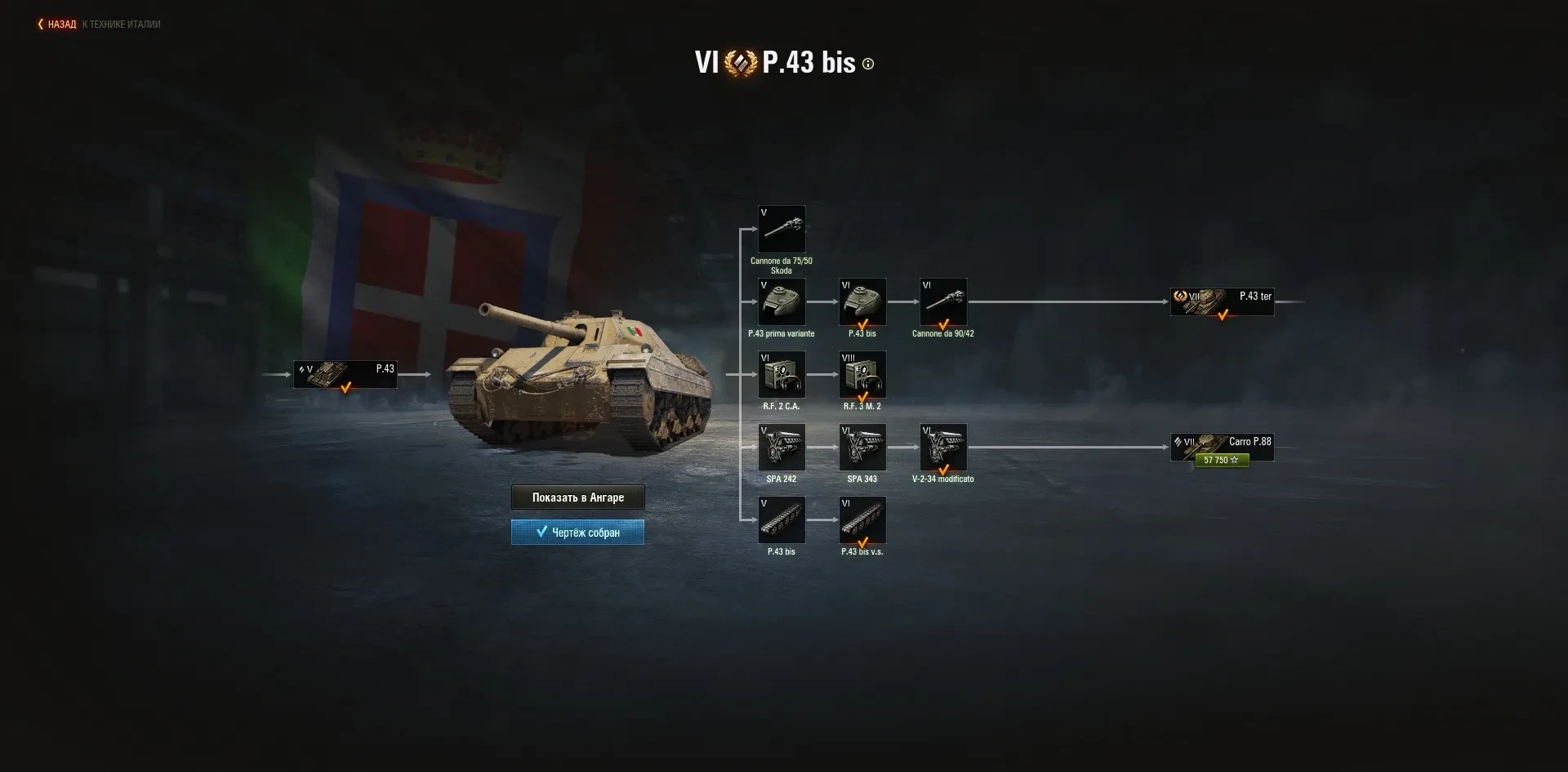 — 649 500 ex. (вся подветка полностью напрямую с модулями, начиная с исследования самого 7-го уровня Carro d'assalto P.88, но можно сэкономить на P.43 bis 57 750 опыта).