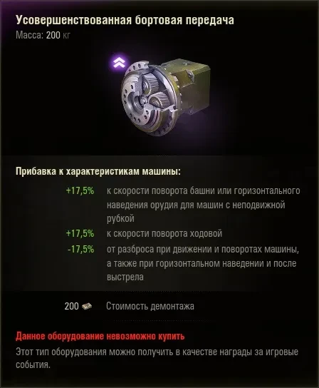 Усовершенствованная версия механизмов поворота, имеет больший эффект: +17,5% к скорости горизонтального наведения, +17,5% к скорости поворота ходовой, -17,5% от разброса при движении и поворотах.