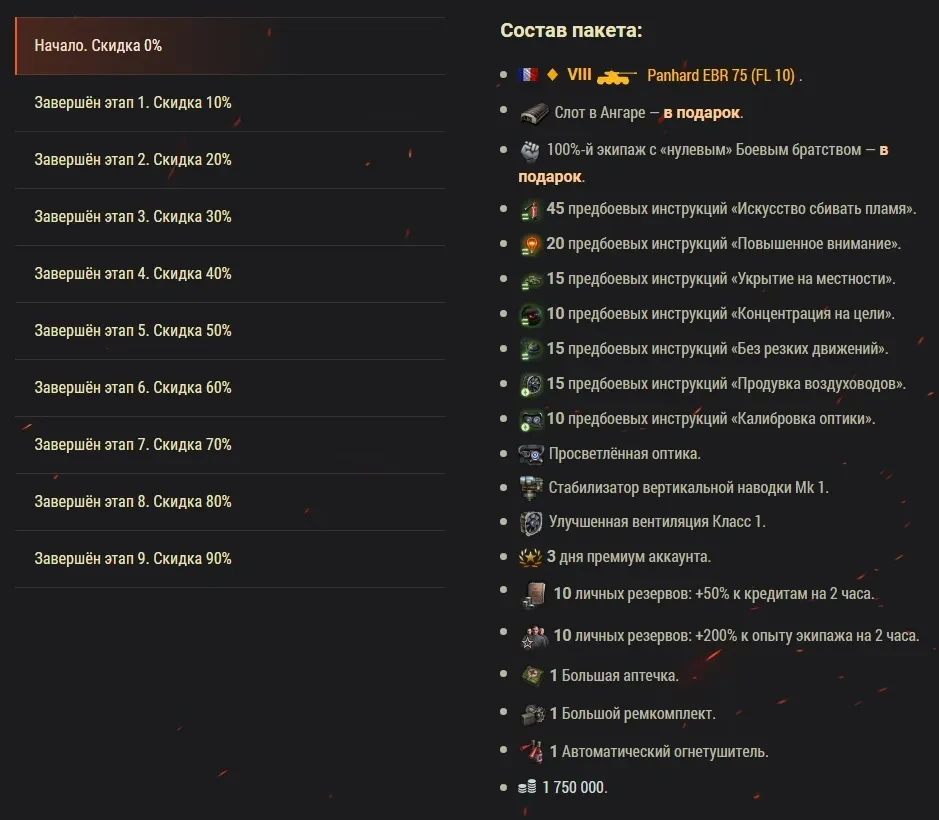 Завершая каждый этап боевых задач «Охоты на разведчика», вы получаете не только промежуточные награды, но и скидку 10% на специальный набор с Panhard EBR 75 (FL 10) в Премиум магазине.
