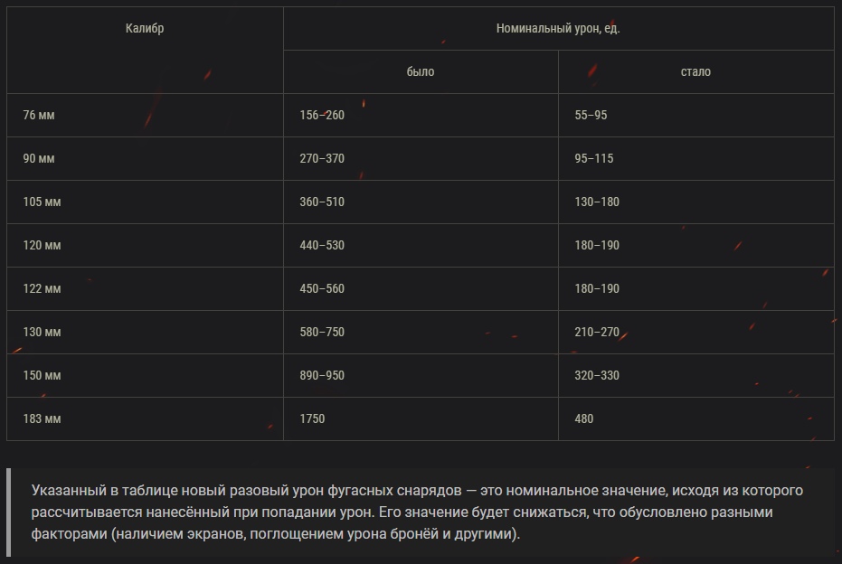 ** Важно: основной целью изменений станет балансировка эффективности фугасов для всех орудий в игре. Крупным калибрам на тесте мы понизили разовый урон. Фугасным снарядам средних и малых калибров — повысили.