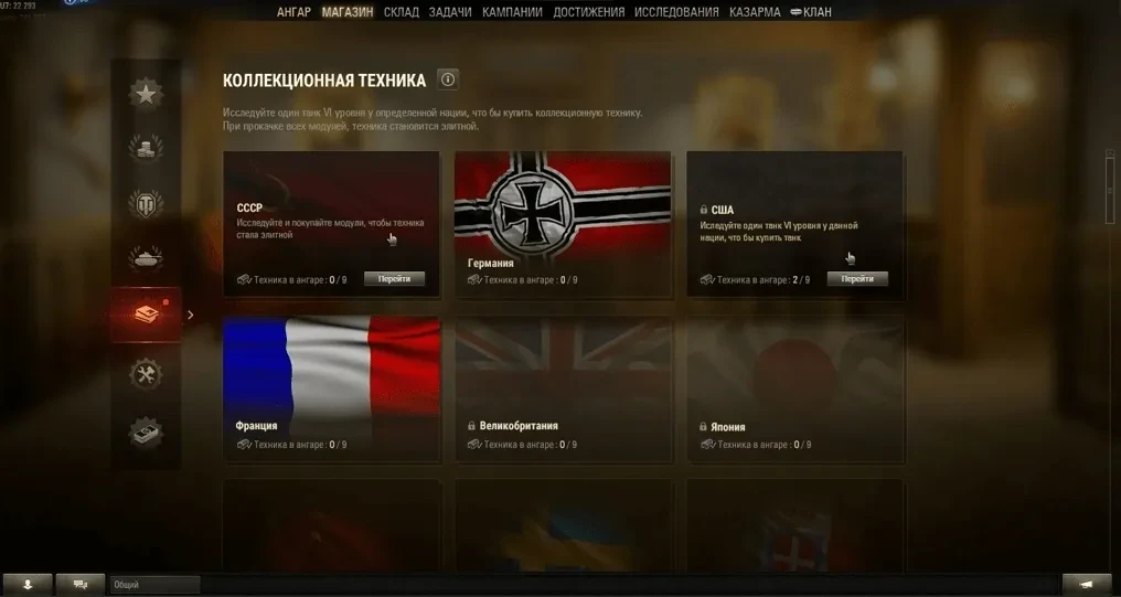 Танки I–V уровней добавлены в отдельную вкладку «Коллекционная техника» в игровом магазине. Эта техника не будет выведена из игры, а просто переместится в новую вкладку и будет разделена по нациям. Есть два способа попасть туда: через игровой магазин и из дерева исследований. Чтобы получить доступ к коллекционной технике определённой нации, вам необходимо исследовать хотя бы одну машину VI уровня этой нации.