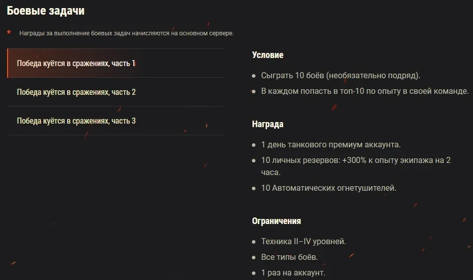 Во время тестирования будут доступны специальные боевые задачи. Для получения наград выполните условия задач и заполните специальный опросник, который будет разослан через клиент игры после 19 февраля. Как только вы ответите на все вопросы, на основном сервере вам будут начислены все награды за выполненные задачи.