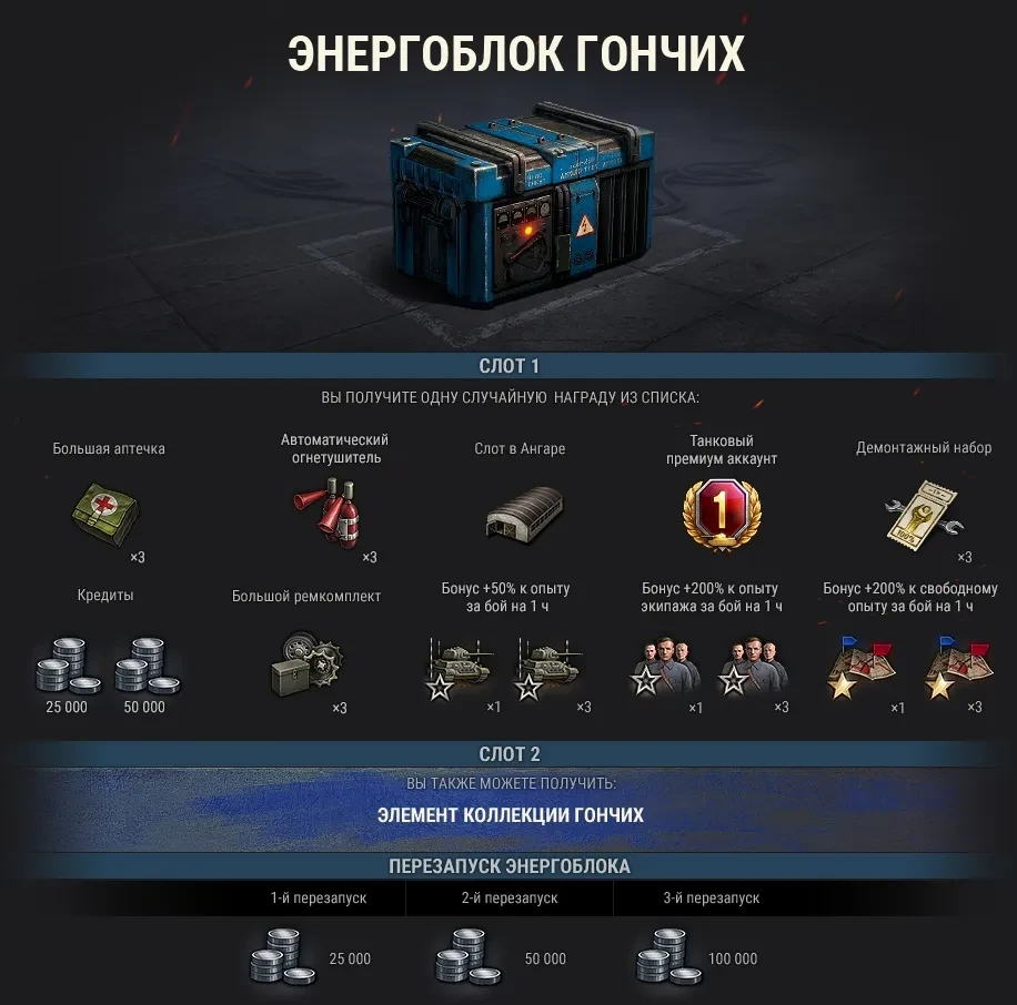 Перезапуск энергоблоков Гончих и Инженера доступен 3 раза за кредиты. Перезапустить Спецэнергоблок можно 5 раз, но уже за игровое золото.