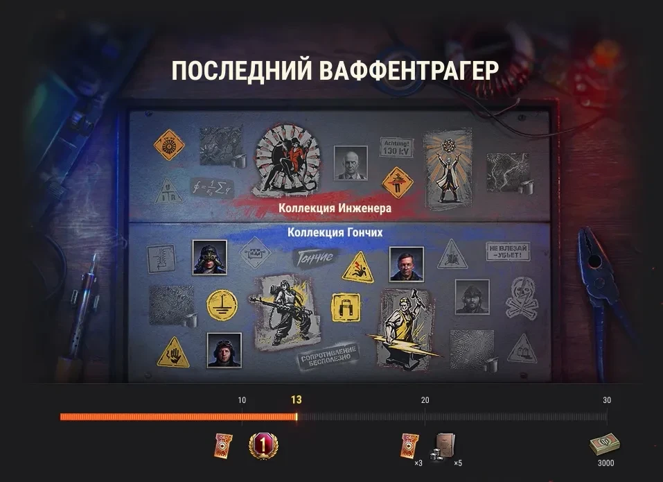 В событии «Последний Ваффентрагер» две прогрессии: одна для отряда «Гончих», другая — для Инженера, а также единый индикатор прогресса. Выполняйте специальные боевые задачи и получайте энергоблоки — контейнеры с уникальными наградами. Энергоблоки Гончих и энергоблоки Инженера содержат элементы для одной из двух коллекций события и другие игровые ценности. Чтобы заполнить индикатор прогресса и получить все награды игрового события, понадобится собрать обе коллекции.