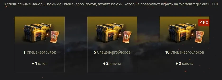 В специальные наборы, помимо Спецэнергоблоков, входят ключи, которые позволяют играть на Waffenträger auf E 110.