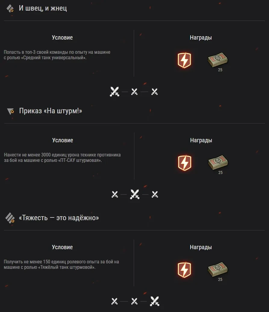 Тем, кто пройдёт в лигу, станут доступны ежедневные боевые задачи для разных ролей техники. Всего будет три боевые задачи. За их выполнение вы будете получать боны и ежедневные призовые бои.