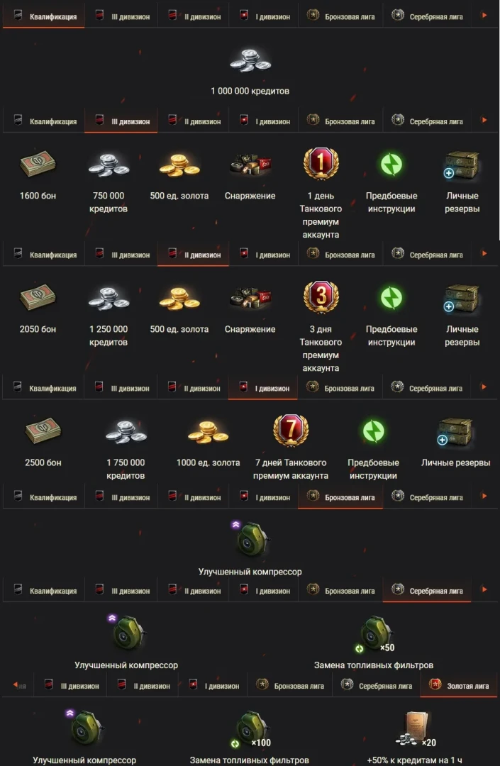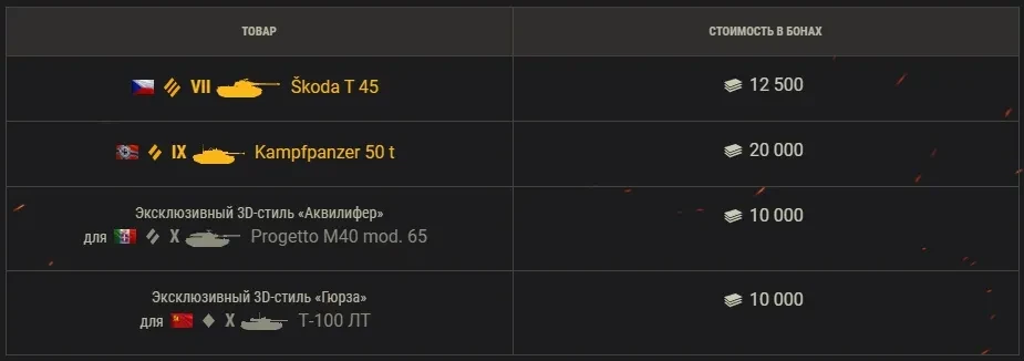 В сезоне X Ранговых боёв у вас не будет новой накопительной скидки. Однако появится возможность использовать ранее накопленную персональную скидку на товары за боны. Добравшись до второго дивизиона, вы сможете приобрести за боны товары, указанные ниже.