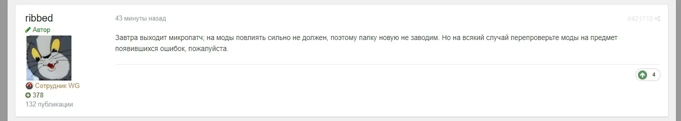 Завтра выходит микропатч; на моды повлиять сильно не должен, поэтому папку новую не заводим. Но на всякий случай перепроверьте моды на предмет появившихся ошибок, пожалуйста.