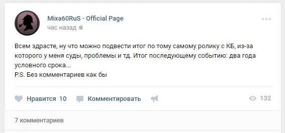 «Всем здрасте, ну что можно подвести итог по тому самому ролику с КБ, из-за которого у меня суды, проблемы и тд. Итог последующему событию: два года условного срока...