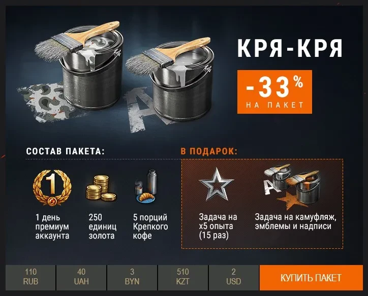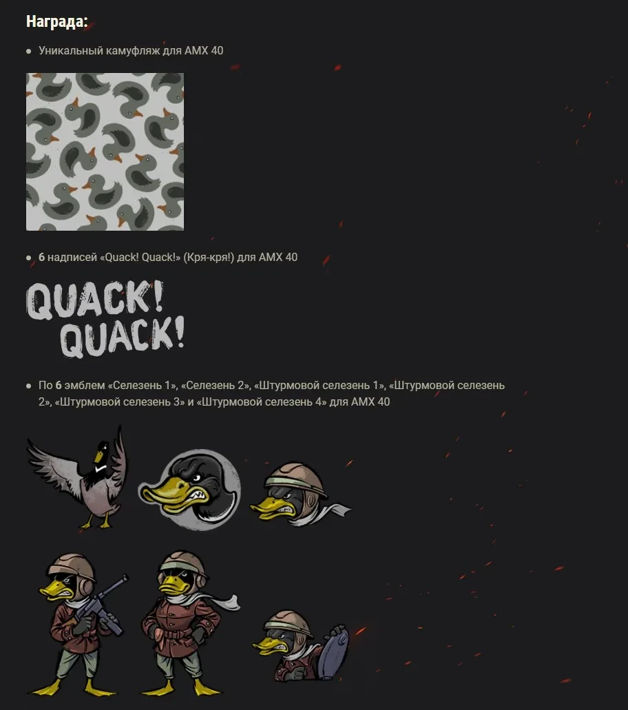 Разработчики наконец спустя столетия вспомнили об утином камуфляже. Можно получить его за цепочку боевых задач «Позывной: Кря-Кря» или купить за 110 рублей ($2) пакет. А обещали бесплатно раздать в патче 9.22, как памятку о последней машине в HD, не так ли? Ну ладно, не зря выкупали Amx 40.