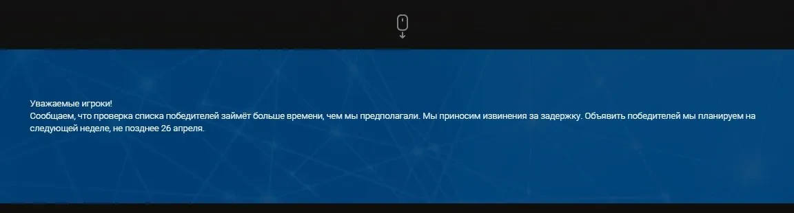 Сообщаем, что проверка списка победителей займёт больше времени, чем мы предполагали. Мы приносим извинения за задержку. Объявить победителей мы планируем на следующей неделе, не позднее 26 апреля.»