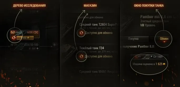 Проходящие в игре скидочные акции влияют на стоимость сдаваемого и покупаемого танка — это будет наглядно отображено в окне обмена.