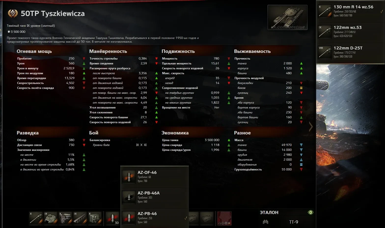 Актуальные данные для 50TP Tyszkiewicza (ТТ-9, Польша, прокачиваемый). Итерация 2. Экипаж 4 человека, перед Вами полные ТТХ машины. На выбор 3 орудия. Мощный урон и отличные фугасы, всё как вы хотите и любите! Моделька уже готовая.