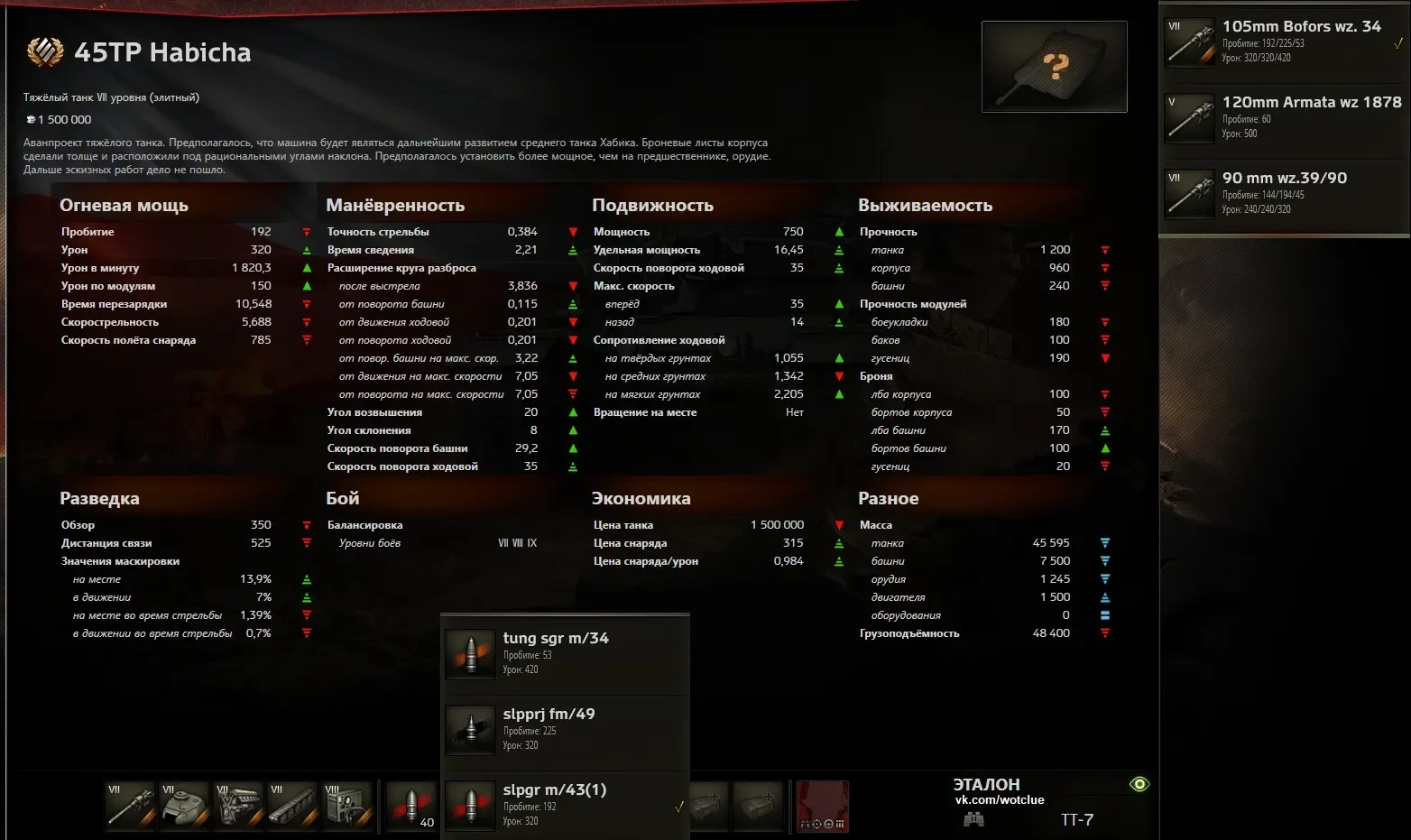 На супертест вышел новый танк 45TP Habicha (ТТ-7, Польша, прокачиваемый). Спускаемся с высоких гор на middle-level. С данного танка и начинается самое тяжелое восхождение к ТОПу. На выбор идёт 3 орудия, но отметим мы топовое и, внезапно, фугасницу Хабика [500/60]. Кхм, интересное решение от разработчиков. Когда уже премы фугасные будут (без иронии)