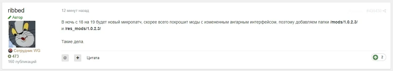 В ночь с 18 на 19 будет новый микропатч, скорее всего покрошит моды с измененным ангарным интерфейсом, поэтому добавляем папки /mods/1.0.2.3/ и /res_mods/1.0.2.3/