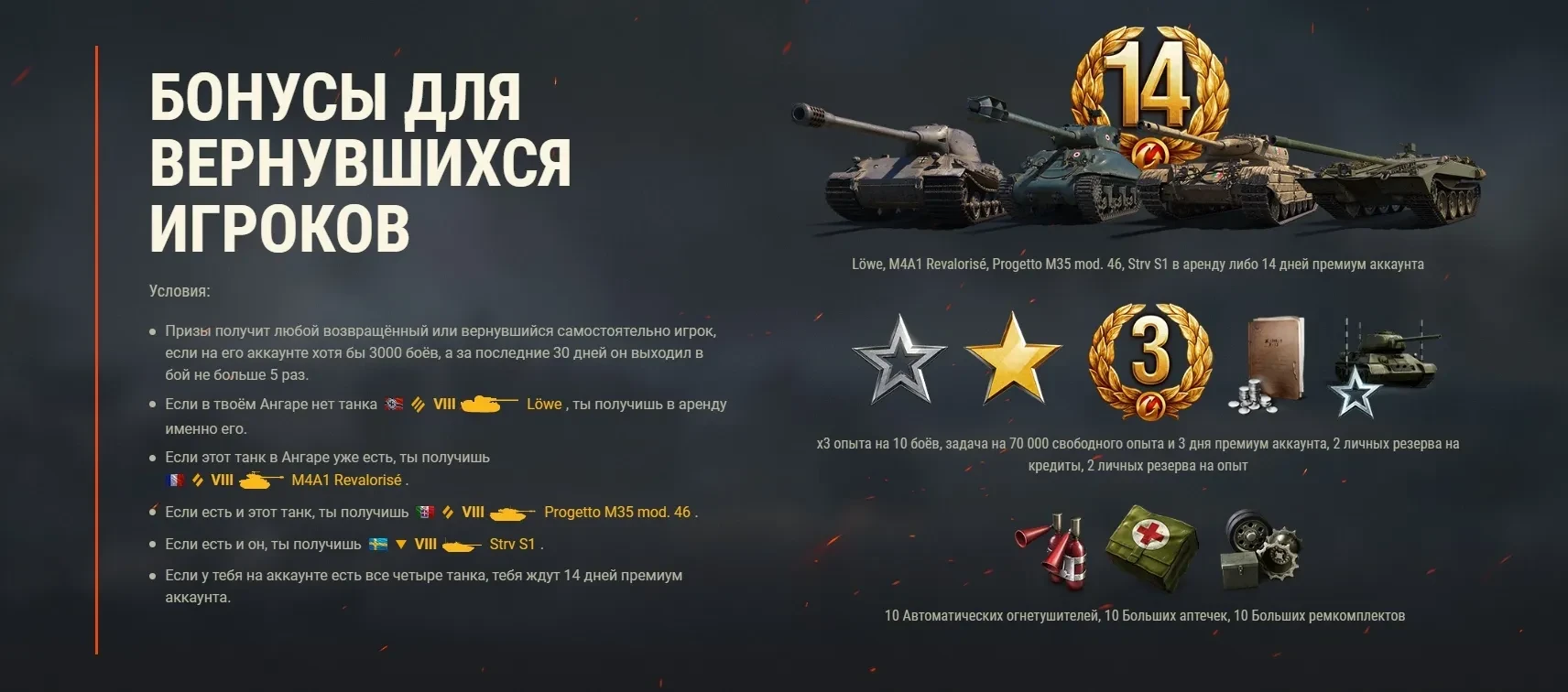 Можно получить награду, вернувшись в игру самостоятельно, а не только по приглашению другого игрока. Вернувшийся игрок должен соответствовать следующим требованиям: у него должно быть не менее 3000 боёв на аккаунте, а количество проведённых боёв за последние 30 дней не должно превышать 5.