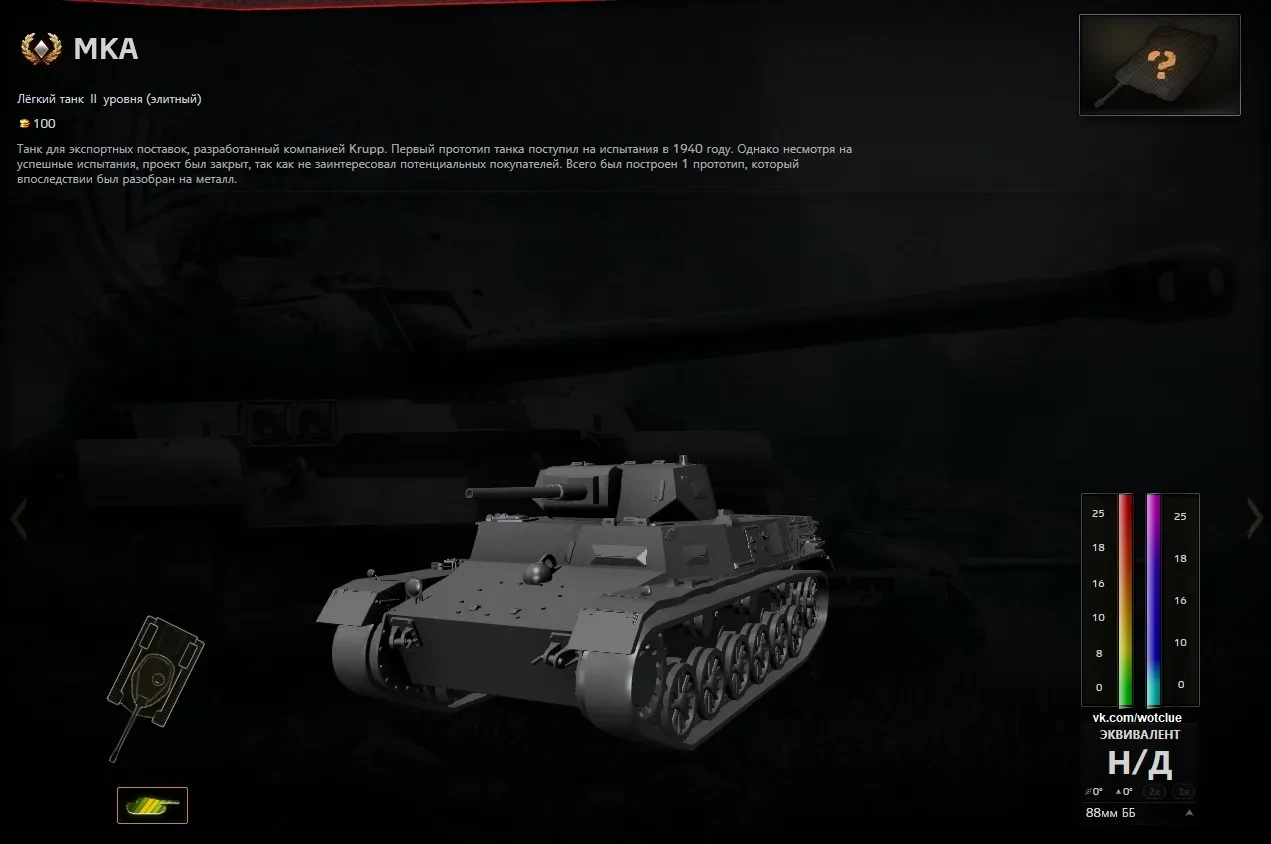 На супертест WoT сегодня вышел подарочный премиум танк с коротким названием MKA (ЛТ-2, Германия, прем). Орудие всего 4,5 cm и это очень мало, приговор для танка. Полное название танка читается как mittlerer Kampfwagen für Ausland.