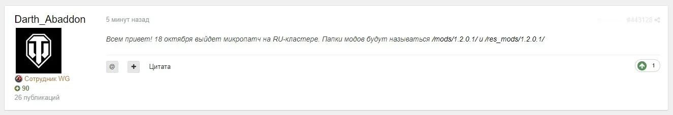 Всем привет! 18 октября выйдет микропатч на RU-кластере. Папки модов будут называться /mods/1.2.0.1/ и /res_mods/1.2.0.1/