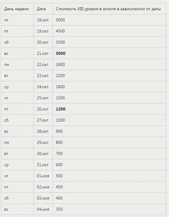 * Дата — Стоимость XIII уровня в золоте в зависимости от даты:
