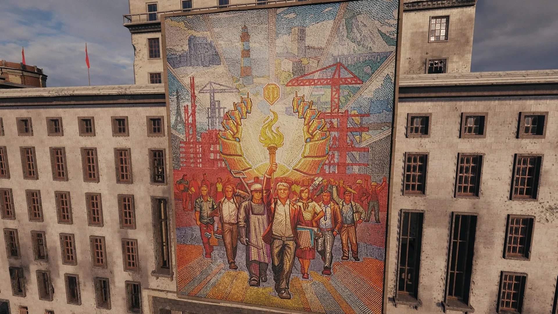 - На мозаике, которая расположена на одном из зданий Энска если присмотреться, можно увидеть загрузочные экраны карт — Париж, Затерянный город, Утес, Монастырь, Ласвилль, и др. (слева направо).