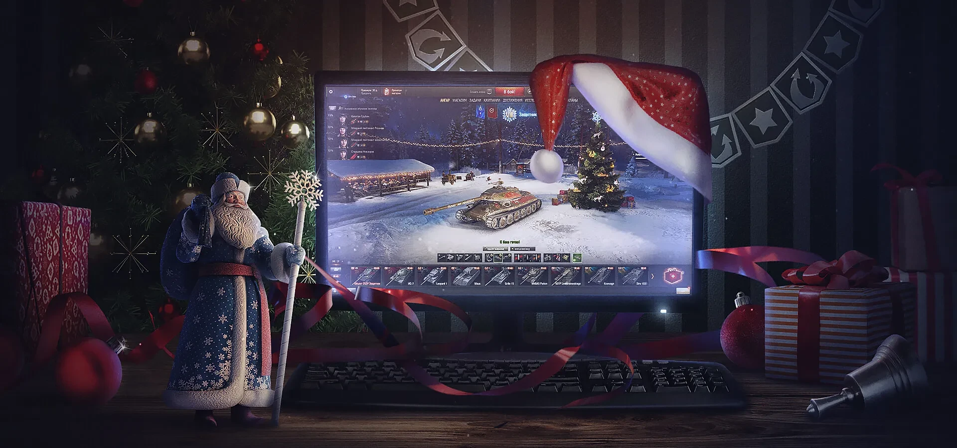 Оп, первые подробности для Нового года WoT в этом году. Можно увидеть на данном арте снова условные лутбоксы, новый и первый зимний ангар в HD, задачи для Ёлки и бусты от прокачки и для прокачки.