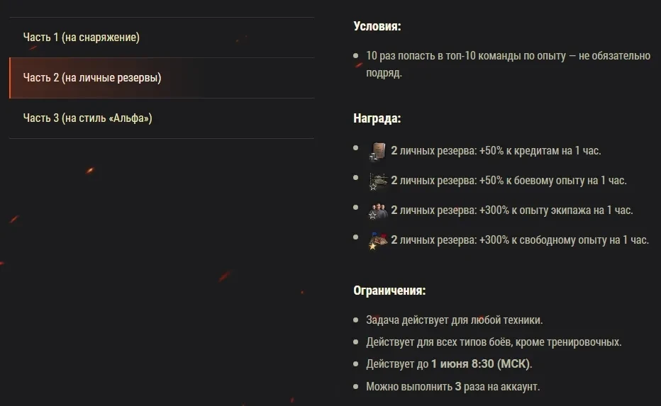 - Попадите в число первых 3000 (Россия)/1000 (Украина)/1000 (Беларусь) участников, выполнивших условие акции, и получите доступ к боевым задачам «Заслуженная награда»! (т.е. всего 5k стилей суммарно).
