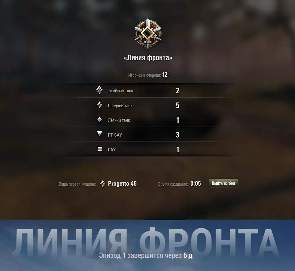 В верхнем правом углу выбираем режим боя «Линия фронта», жмём на появившийся посредине селектор в виде своеобразного цветка с цифрой 1 (над вашим танком).