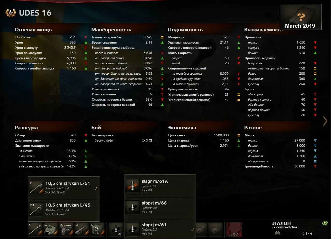 UDES 16 (СТ-9, Швеция, прокачиваемый, механика: «гидропневматическая подвеска») с настроенными ТТХ. Напомним, что чуть ранее, когда все три машины отправились на тестирование, UDES 16 не был полноценно настроен. Бронирование танка также иное.