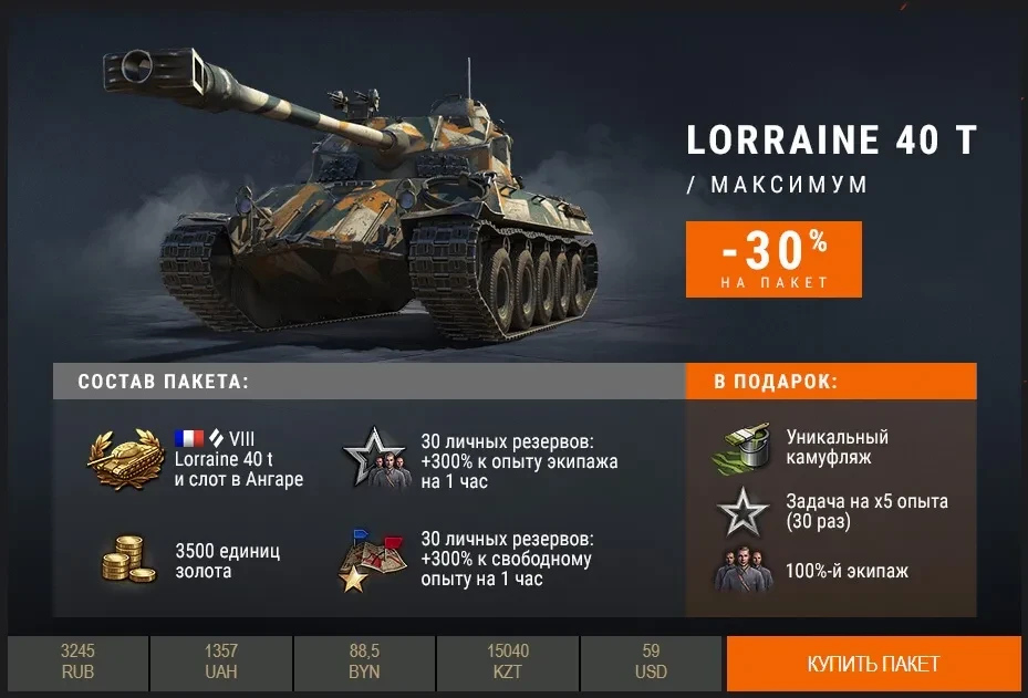 Если Lorraine 40 t у вас есть, то при покупке пакетов вы получите остальное имущество из них (слоты, экипаж, игровое золото, личные резервы, боевые задачи), кроме самой машины. За неё вам будет начислена компенсация игровым золотом — 10.700.