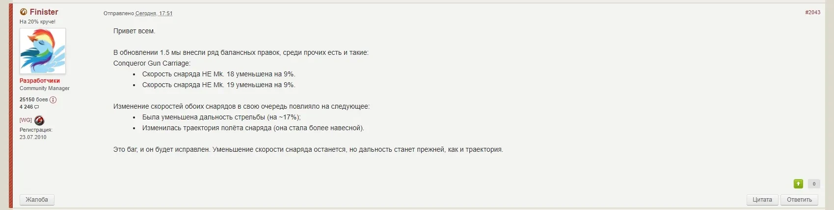 Это баг, и он будет исправлен. Уменьшение скорости снаряда останется, но дальность станет прежней, как и траектория.»