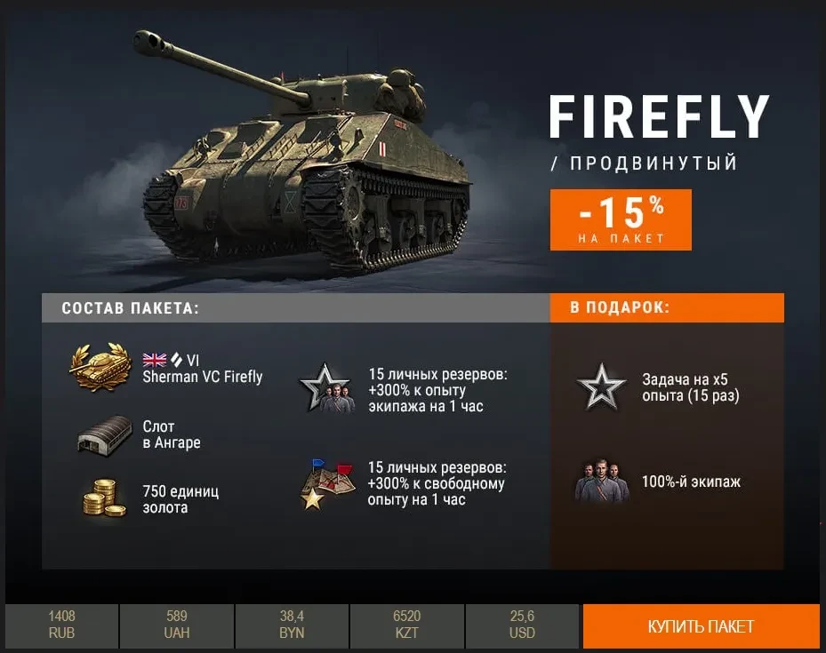 Если Sherman VC Firefly у вас уже есть, то при покупке пакетов вы получите остальное имущество из них (слоты, экипаж, игровое золото, личные резервы, боевую задачу), кроме самой машины. За неё вам будет начислена компенсация игровым золотом — 3 200.