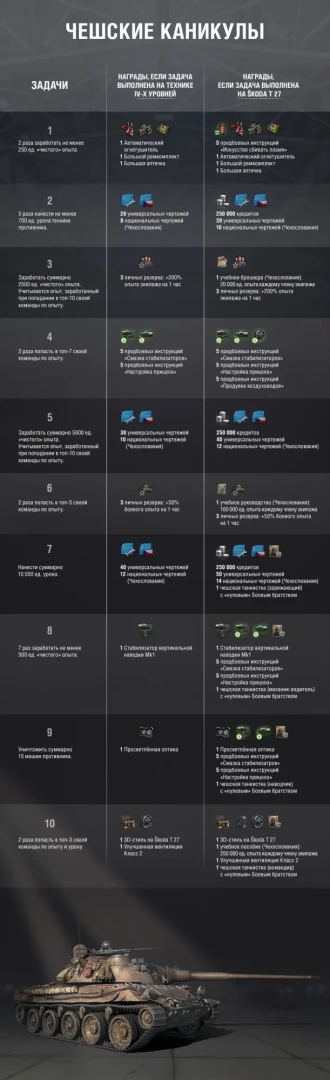 * Задачи игрового события «Чешские каникулы» можно выполнять соло или взводом в случайных боях (в том числе генеральном сражении) на технике IV–X уровней. При этом, участвуя в событии на новом танке VIII Škoda T 27 (Чехословакия, СТ-8, прем, барабан), первой премиум «восьмёрке» в чехословацкой ветке, вы сможете получить дополнительные награды: