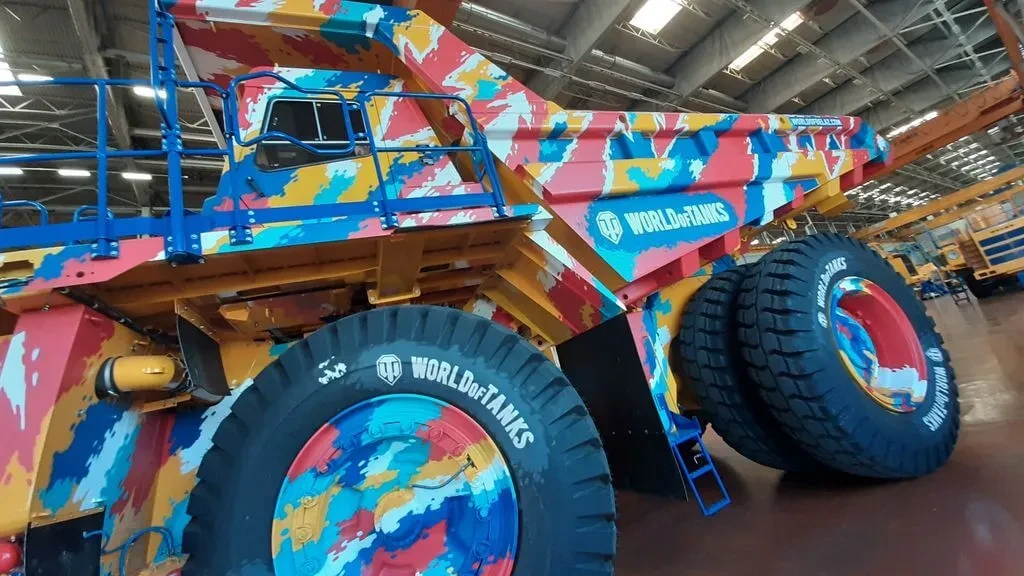 Машина, на которую был нанесен танковый камуфляж, — это карьерный самосвал грузоподъемностью в 90 тонн. В высоту он достигает 5,34, а в ширину 6,4 метра, его вес без груза составляет 74 тонны, что приблизительно равно двум с половиной танкам Т-34-85, особенно популярным у игроков World of Tanks.