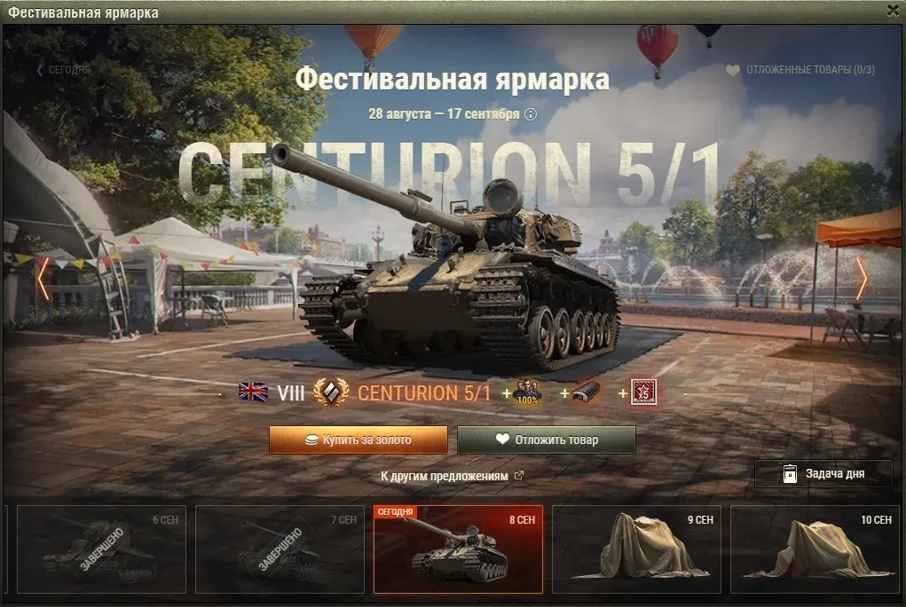 Танк дня: Centurion Mk. 5/1 RAAC. Набор стандарт: Цена — 7.600 gold. в клиенте игры. 12 день Фестивальной ярмарки World of Tanks.