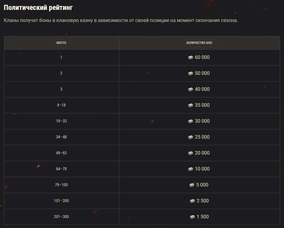 Второй набор наград кланы получат за позицию в политическом рейтинге на момент окончания сезона. Чем выше позиция клана в этом рейтинге, тем больше бон он сможет получить в свою казну.