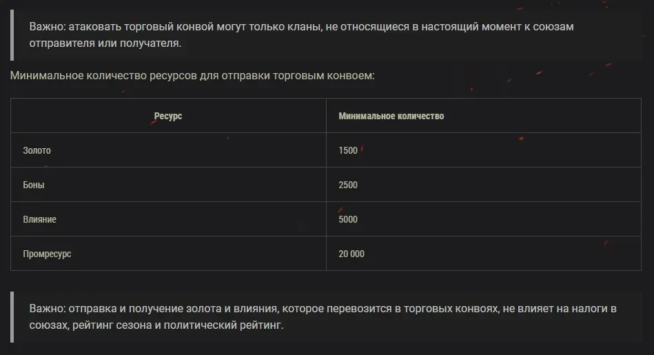 ** Важно: отправка и получение золота и влияния, которое перевозится в торговых конвоях, не влияет на налоги в союзах, рейтинг сезона и политический рейтинг.